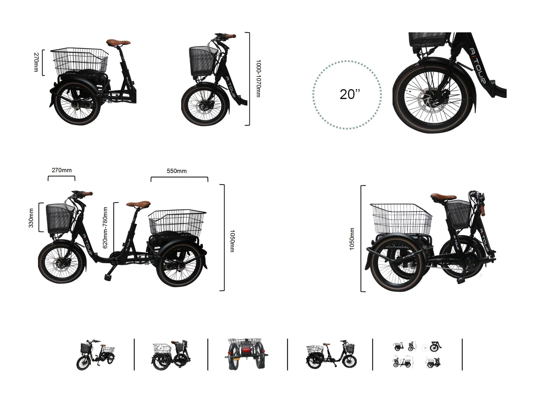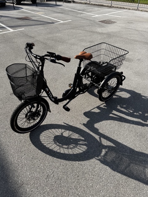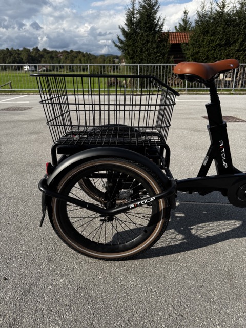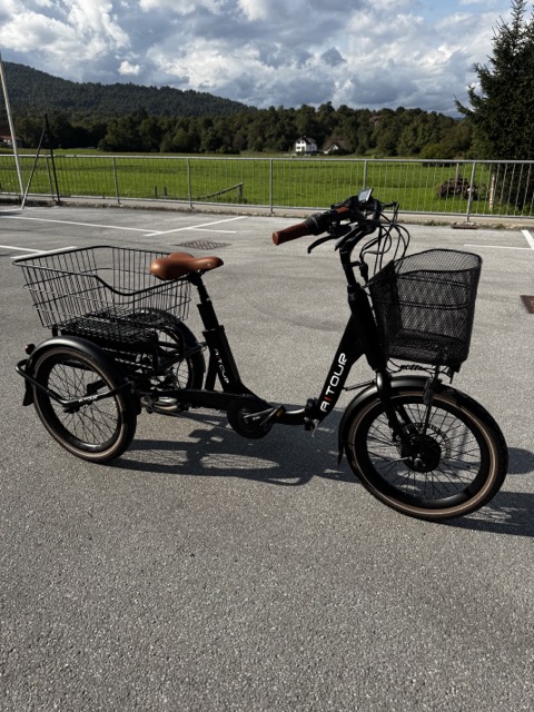 Električen tricikel nizozemskega proizvajalca Aitour, model Mini, namenjen za starejše in vse osebe, ki imajo težave z ravnotežjem. Nizka vstopna višina, velika košara za tovor ter zanesljiv električen pogon, omogočajo varno in brezskrbno vožnjo brez ali z električnim pogonom, po ravnem in po klancih.